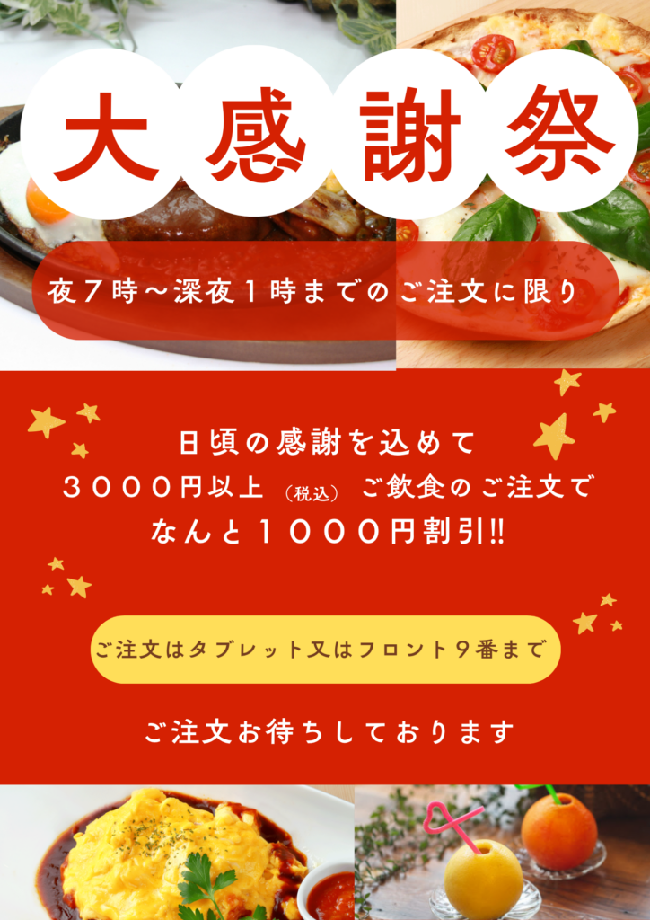 ご飲食3000円以上のご利用でなんと1000円割引‼(夜7時~深夜1時までのタイムサービス)