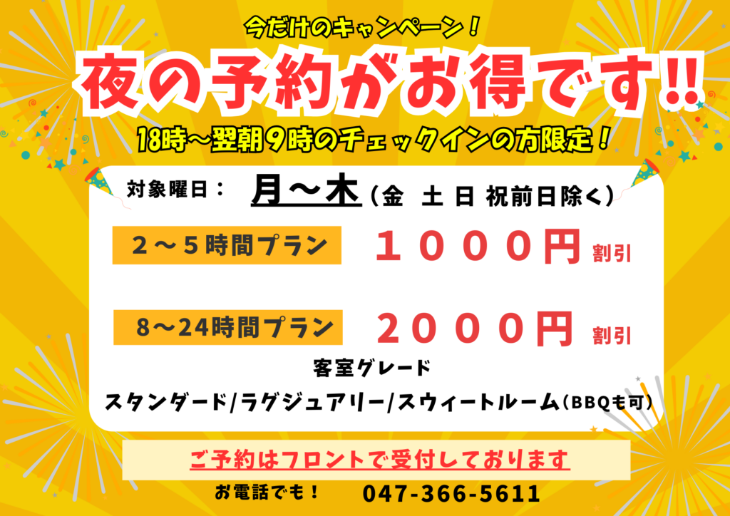 ★平日:月~木 18時~翌朝9時のチェクインのお客様限定特典★