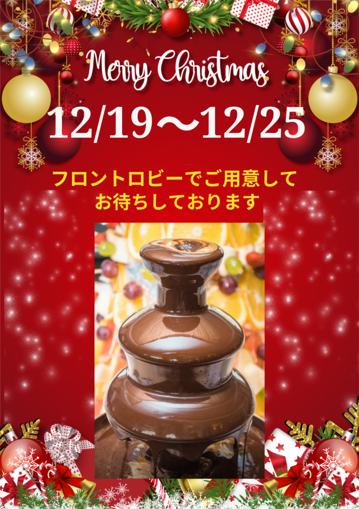 12/19(金)~ 12/25(木)Xmas期間限定でフロントロビーでチョコレートファウンテンを設置してお待ちしております。